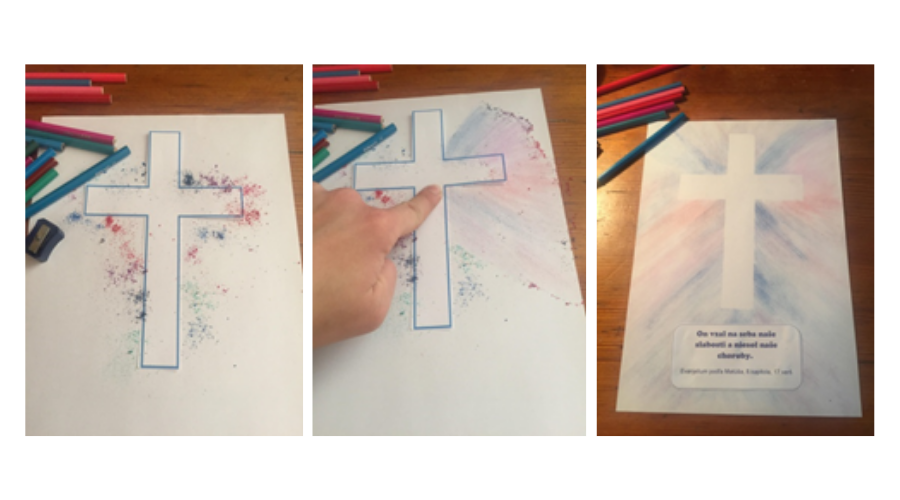 - vystrihnutý kríž, čistý papier, farbičky, strúhadlo